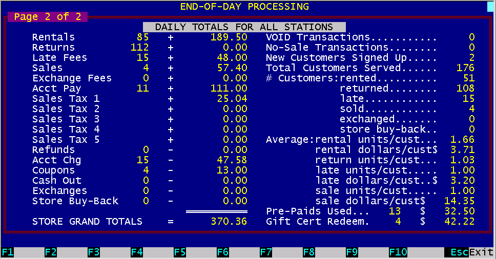 End of day processing is composed of two main functions. First is the cash-drawer ring-out from each station, the second is the storewide ring-out. The individual station cash-drawer ring-out is performed directly from the POS screen. While you are in the POS screen, pressing the ALT key and F9 key (ALT F9) combination together will display the cash-drawer status for that station. This screen is a summary of the individual station's activity since the last time this station was cleared. The bottom right side of the screen displays the dollar amount totals for cash, checks and credit card vouchers that should be in the drawer. Any deviation from the amount displayed (over/under) indicates a discrepancy. Each station will display all the activity on the indicated station number since the last time it was cleared. There is a session number displayed on the screen and printed on the reports. This session number is an individual number for each workstation and is automatically incremented every time you clear the workstation. The purpose of this session number is to prevent an employee from ringing out a station and starting a new session without your knowledge. An example would be if an employee gives you session number 231 yesterday and 233 today, you know they have cleared the station total for session number 232 and not given you the money and the report for that session. If you have multiple stations, you can ring out all stations from any of the stations This may be necessary since only one station may have a report printer attached to it. If you want to ring-out station other than the one you are on, you must exit BizPie on the other station first. You just enter the station number you want to ring out, on the current station, and press Function Key F9 (Go) to start the ring-out process. When its completed, you can type in another stations number to ring-out. If you want to automatically ring-out all the stations, just enter a "0" (zero) for the station number. This will tell BizPie to ring-out all available stations on the system starting with the highest number. Make sure the last station number to ring-out is the one you are on, since you will be asked to enter the beginning amount of cash-drawer money for the next session. The ring-out report will show you the same data as displayed on the screen. In addition, it will give you a worksheet for recording the paper and coin counts. You can add the totals in the drawer and compare with the totals on the report, then record the discrepancy if over or under. The next page printed after the cash-drawer status report will be the sales category report for rentals, late fees and sales.