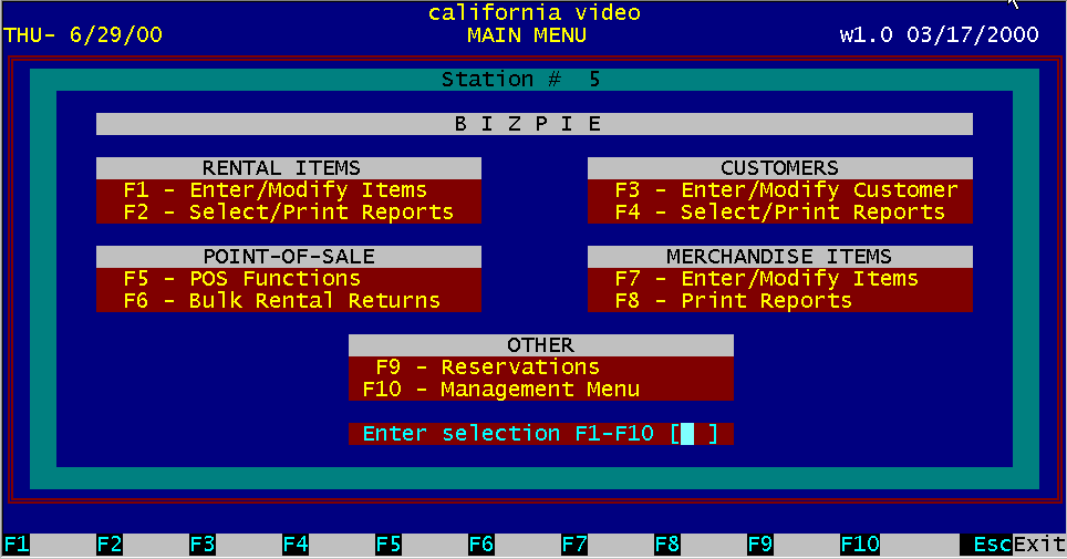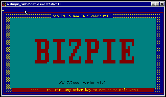 3.5.1 Selecting from the Main Menu To select the section of the BizPie to run, type in the appropriate number and press the "Enter" key. You will immediately see the selected menu option screen displayed. Now you may proceed to use the section. Pressing the "Esc" (Escape) key will always return you to the previously used section from anywhere in If you press the "Esc" key at the Main Menu, the system displays a special screen with "BizPie" on it as