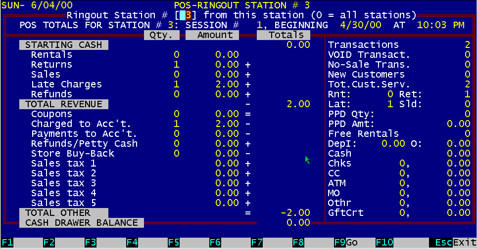 End of day processing is composed of two main functions. First is the cash-drawer ring-out from each station, the second is the storewide ring-out. The individual station cash-drawer ring-out is performed directly from the POS screen. While you are in the POS screen, pressing the ALT key and F9 key (ALT F9) combination together will display the cash-drawer status for that station. This screen is a summary of the individual station's activity since the last time this station was cleared. The bottom right side of the screen displays the dollar amount totals for cash, checks and credit card vouchers that should be in the drawer. Any deviation from the amount displayed (over/under) indicates a discrepancy. Each station will display all the activity on the indicated station number since the last time it was cleared. There is a session number displayed on the screen and printed on the reports. This session number is an individual number for each workstation and is automatically incremented every time you clear the workstation. The purpose of this session number is to prevent an employee from ringing out a station and starting a new session without your knowledge. An example would be if an employee gives you session number 231 yesterday and 233 today, you know they have cleared the station total for session number 232 and not given you the money and the report for that session. If you have multiple stations, you can ring out all stations from any of the stations This may be necessary since only one station may have a report printer attached to it. If you want to ring-out station other than the one you are on, you must exit BizPie on the other station first. You just enter the station number you want to ring out, on the current station, and press Function Key F9 (Go) to start the ring-out process. When its completed, you can type in another stations number to ring-out. If you want to automatically ring-out all the stations, just enter a "0" (zero) for the station number. This will tell BizPie to ring-out all available stations on the system starting with the highest number. Make sure the last station number to ring-out is the one you are on, since you will be asked to enter the beginning amount of cash-drawer money for the next session. The ring-out report will show you the same data as displayed on the screen. In addition, it will give you a worksheet for recording the paper and coin counts. You can add the totals in the drawer and compare with the totals on the report, then record the discrepancy if over or under. The next page printed after the cash-drawer status report will be the sales category report for rentals, late fees and sales.