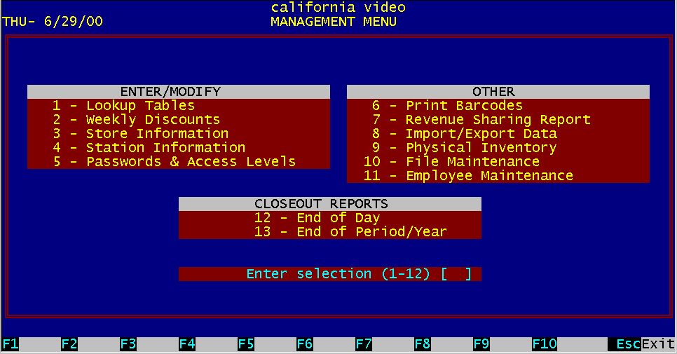 3.6.1 Selecting from the main menu Selecting choice number ten of the Main Menu will take you to a submenu for the Management Functions (Figure 3.4). This menu may be password protected, just as the other menu choices. To use any of the choices presented in the Management Menu, you must enter the appropriate password to proceed ii passwords are implemented. Pressing the "Esc" (Escape) key will return you to the previous screen, which was the Main Menu.