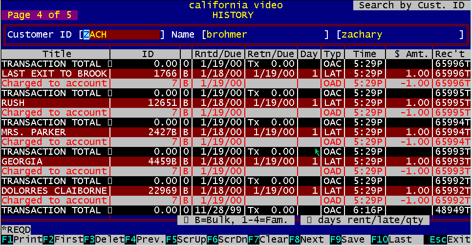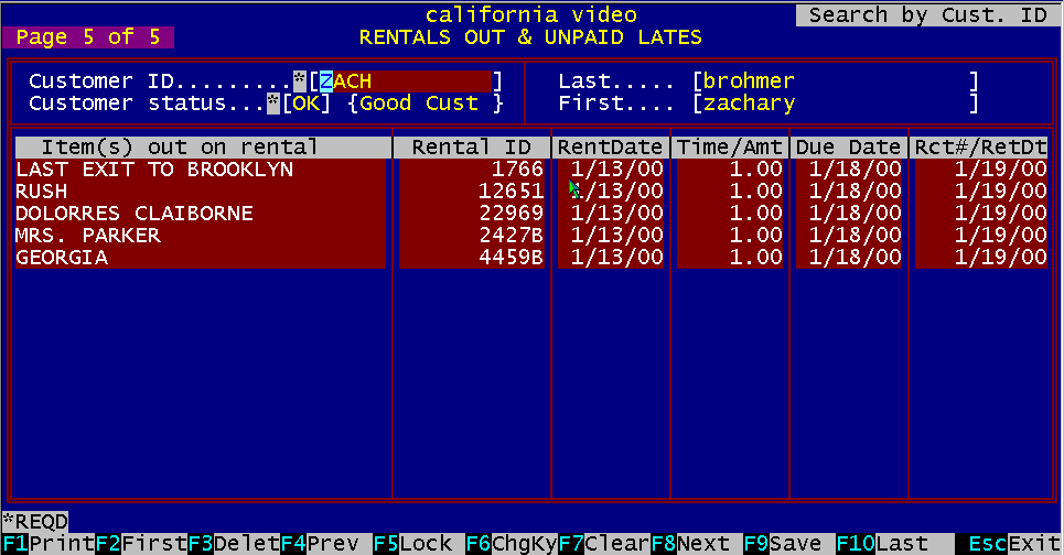 This screen displays all of the tapes that are currently out on rental for a customer. The tape main title, tape ID number, date rented, date and time due back and the late return date are displayed. If the customer returns a tape late, and there is a late fee owed but not collected, the rental item returned late and not paid for will remain on this screen. Example: All five movies were returned late and the late fee was not paid. The amount of the late fee is $1.00 for each movie. If the customer pays the late fee in the future and brings his account balance to zero, the late rental items will be removed from this screen. |