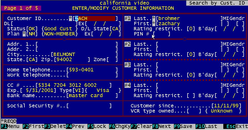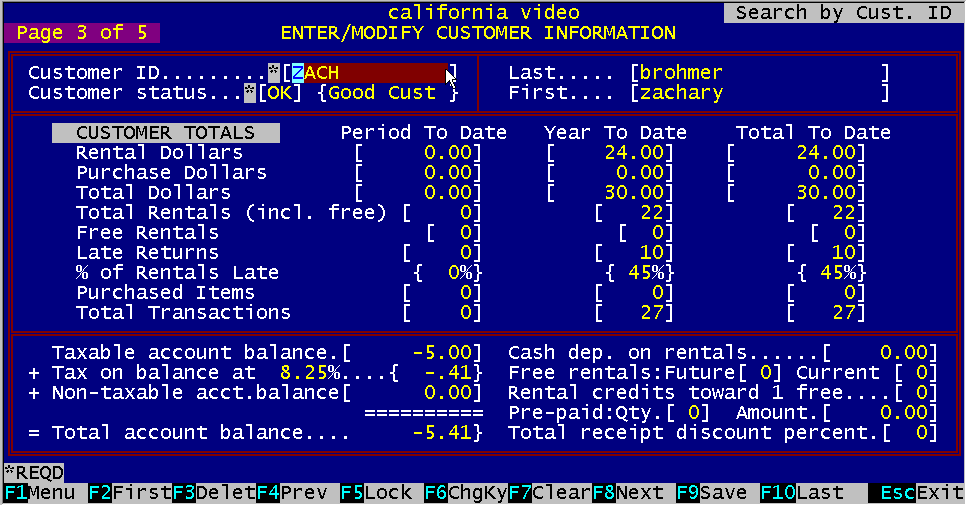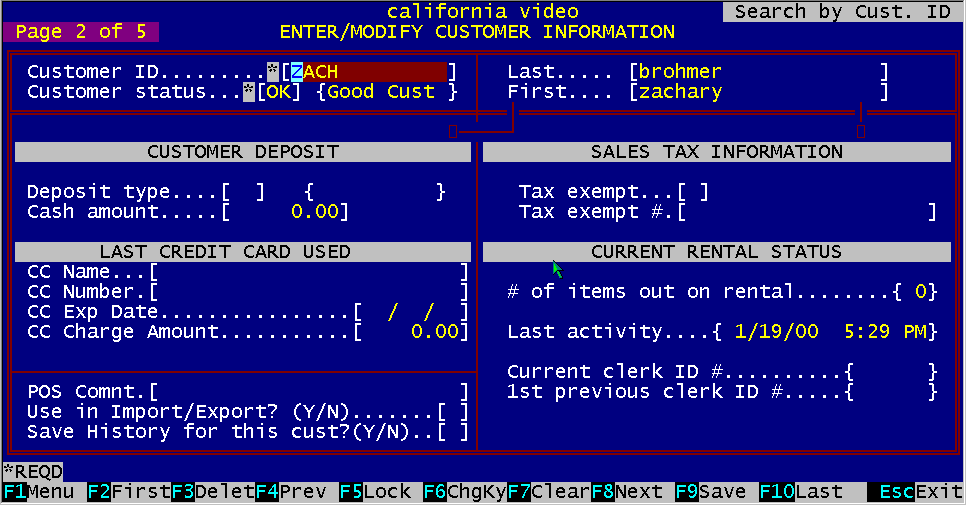 8.1.1 Enter/Modify Customer Information Entering data in the customer information section follows the same procedures as entering information in the "Enter/Modify Rental Items" or "Enter/Modify Merchandise Items" sections. Fields with an (*) are required fields and must be filled in. Other fields are optional but it is suggested that you take the time to fill them in. If this is a change to an existing customer's information, enter his customer number and then press Enter. The existing data about the customer will now be displayed. Use the Enter and arrow keys to find the fields that are to be changed and type over the old information with any new information. Use the "PgUp" (page up) and "PgDn" (page down) keys to change pages of the screen. When all information is correct, press F9 to save it. If this is a new customer, you must assign a new customer ID. Move the highlighted field to the customer number area with the arrow keys or the Enter key. To find the last customer ID used, press FIO function key. Type in the new customer ID and the customer data and use the Enter key to move you from field to field. When you complete entering the data on Screen 1, press the "PgDn" (page down) key to move to Screen 2. Fill in the second screen the same way as you filled in the first screen. When you have entered all the data for both screens, check to see that it is correct. You may return to the first screen by using the "PgUp" (page up) key. If you discover an error, use the Enter key or the arrow keys to move to the field with the error and type over the error. Once both screens are correct, press the F9 key to save the information.